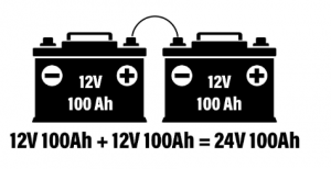 아래 이미지에는 두 가지가 있습니다. 12V 배터리 이 배터리 뱅크를 24V 시스템으로 바꾸는 직렬로 연결됩니다. 또한 은행의 총 용량 등급이 100Ah임을 알 수 있습니다.